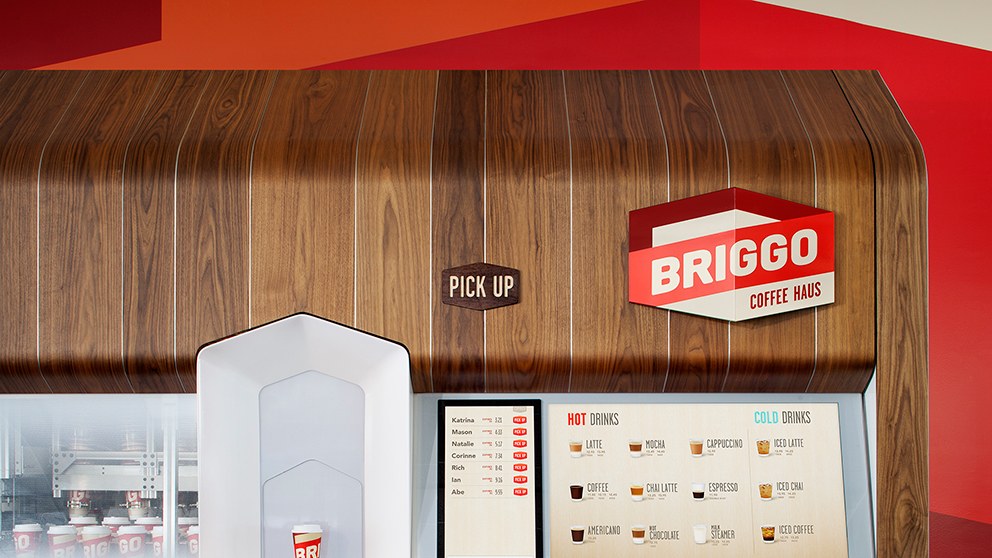 The Briggo startup launched a major project selling kiosk-type robotic coffee bars. Conventional java varieties and gourmet specialties—the menu in a Briggo kiosk is as diverse as in any other fancy brewing spot, featuring about 15 items. Customers enjoy complete visibility into the brewing process—how long it takes to deliver an order, what temperature the water should have, etc.